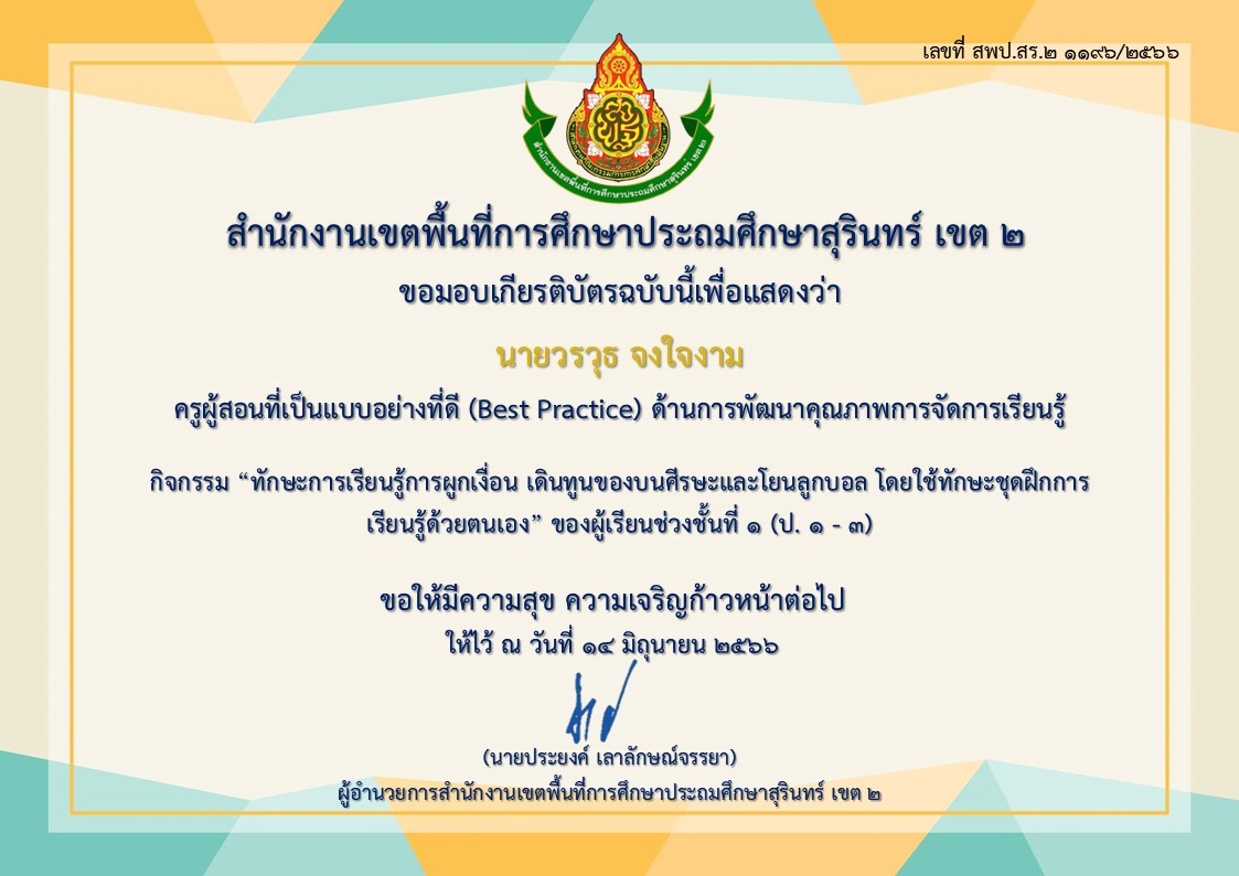 ชื่อผลงาน : ครูผู้สอนที่เป็นแบบอย่างที่ดี (Best Practice) ด้านการพัฒนาคุณภาพการจัดการเรียนรู้ กิจกรรม "ทักษะการเรียนรู้การผูกเงื่อน เดินทูนของบนศีรษะและโยนลูกบอล โดยใช้ทักษะชุดฝึกการเรียนรู้ด้วยตนเอง" ของผู้เรียนช่วงชั้นที่ ๑ (ป. ๑ - ๓) ปี 2566