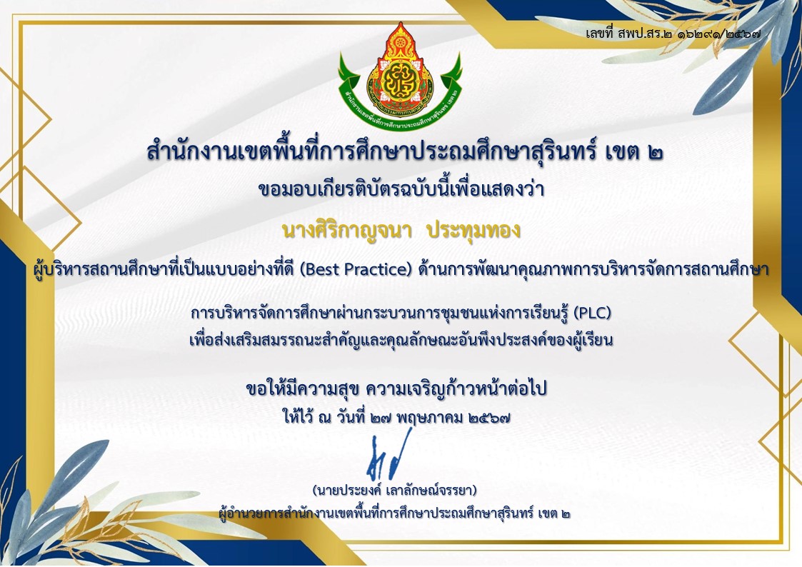 ชื่อผลงาน : ผู้บริหารสถานศึกษาที่เป็นแบบอย่างที่ดี (Best Practice) ด้านการพัฒนาคุณภาพการบริหารจัดการสถานศึกษา การบริหารจัดการศึกษาผ่านกระบวนการชุมชนแห่งการเรียนรู้ (PLC) เพื่อส่งเสริมสมรรถนะสำคัญและคุณลักษณะอันพึงประสงค์ของผู้เรียน ปี 2567