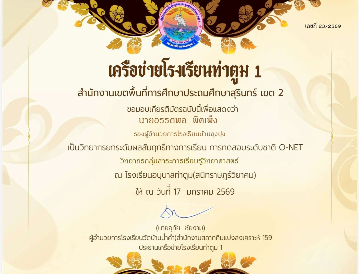 ครูผู้สอนนักเรียน ได้รับรางวัลระดับเหรียญทอง รองชนะเลิศอันดับที่ ๑ กิจกรรม การแข่งขันการสร้าง Webpage ประเภท Web Editor ระดับชั้น ม.๑ - ม.๓ งานศิลปหัตถกรรมนักเรียน ระดับเขตพื้นที่การศึกษาประถมศึกษาสุรินทร์ เขต ๒ ครั้งที่ ๗๓ |