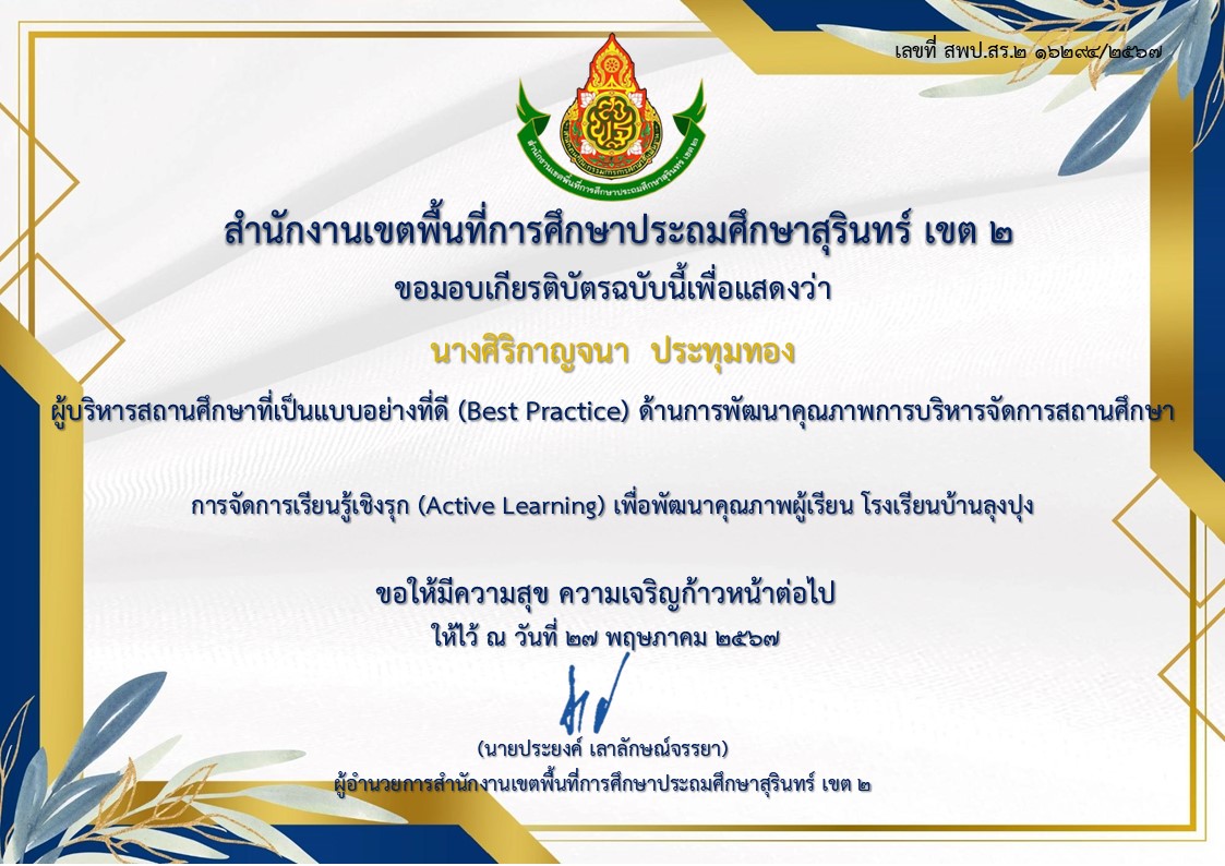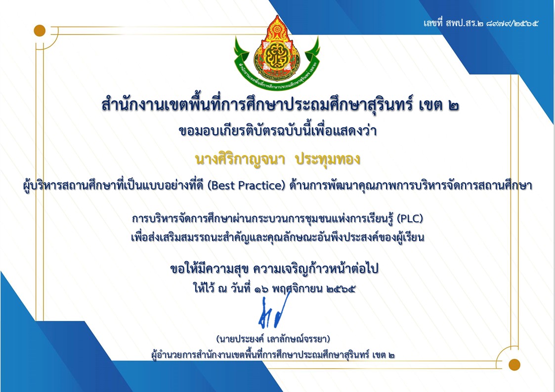 ผู้บริหารสถานศึกษาที่เป็นแบบอย่างที่ดี (Best Practice) ด้านการพัฒนาคุณภาพการบริหารจัดการสถานศึกษา การบริหารจัดการศึกษาผ่านกระบวนการชุมชนแห่งการเรียนรู้ (PLC) เพื่อส่งเสริมสมรรถนะสำคัญและคุณลักษณะอันพึงประสงค์ของผู้เรียน ปี 2567 |