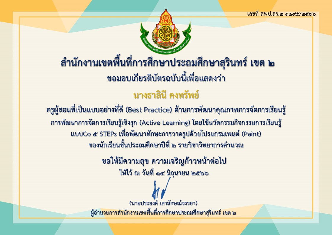 ครูผู้สอนที่เป็นแบบอย่างที่ดี (Best Practice) ด้านการพัฒนาคุณภาพการจัดการเรียนรู้ การพัฒนาการจัดการเรียนรู้เชิงรุก (Active Learning) โดยใช้นวัตกรรมกิจกรรมการเรียนรู้ แบบCo ๕ STEPs เพื่อพัฒนาทักษะการวาดรูปด้วยโปรแกรมเพนต์ (Paint) ของนักเรียนชั้นประถมศึกษาป |