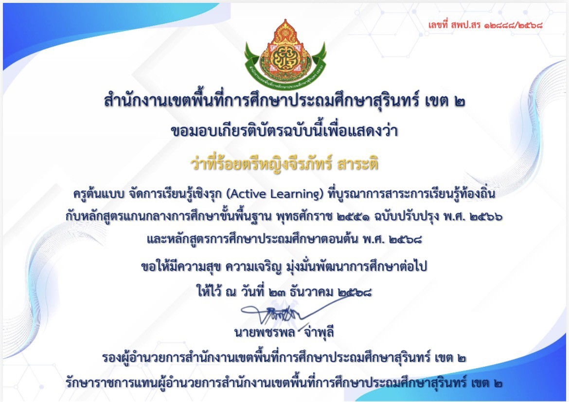ครูต้นแบบ จัดการเรียนรู้เชิงรุก (Active Learning) ที่บูรณาการสาระการเรียนรู้ท้องถิ่น กับหลักสูตรแกนกลางการศึกษาขั้นพื้นฐาน พุทธศักราช ๒๕๕๑ ฉบับปรับปรุง พ.ศ. ๒๕๖๖ และหลักสูตรการศึกษาประถมศึกษาตอนต้น พ.ศ. ๒๕๖๘ |