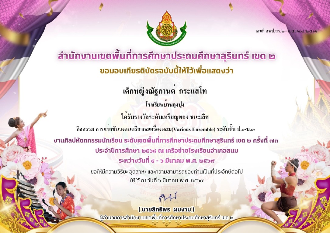 ชื่อผลงาน : ได้รับรางวัลระดับเหรียญทอง ชนะเลิศ กิจกรรม การแขงขันวงดนตรีสากลเครื่องผสม(Various Ensemble) ระดับชั้น ป.๑-ม.๓ งานศิลปหัตถกรรมนักเรียน ระดับเขตพื้นที่การศึกษาประถมศึกษาสุรินทร์ เขต ๒ ครั้งที่ ๗๓