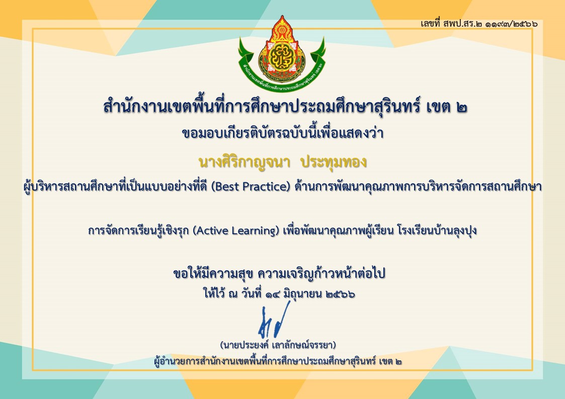 ชื่อผลงาน : ผู้บริหารสถานศึกษาที่เป็นแบบอย่างที่ดี (Best Practice) ด้านการพัฒนาคุณภาพการบริหารจัดการสถานศึกษา การจัดการเรียนรู้เชิงรุก (Active Learning) เพื่อพัฒนาคุณภาพผู้เรียน โรงเรียนบ้านลุงปุง ปี 2566